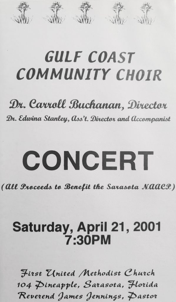 Dr. Buchanan’s legacy in the Manasota area extends beyond the Gulf Coast Community Choir. Together, he and his wife Carol were co-founders and active board members of many well-known local organizations and initiatives including Embracing our Differences, the Democratic Party’s annual Kennedy King Dinner, Florida Studio Theatre, West Coast Black Theatre Troupe, the Opera Guild, and the Selby Library Music Archives.
